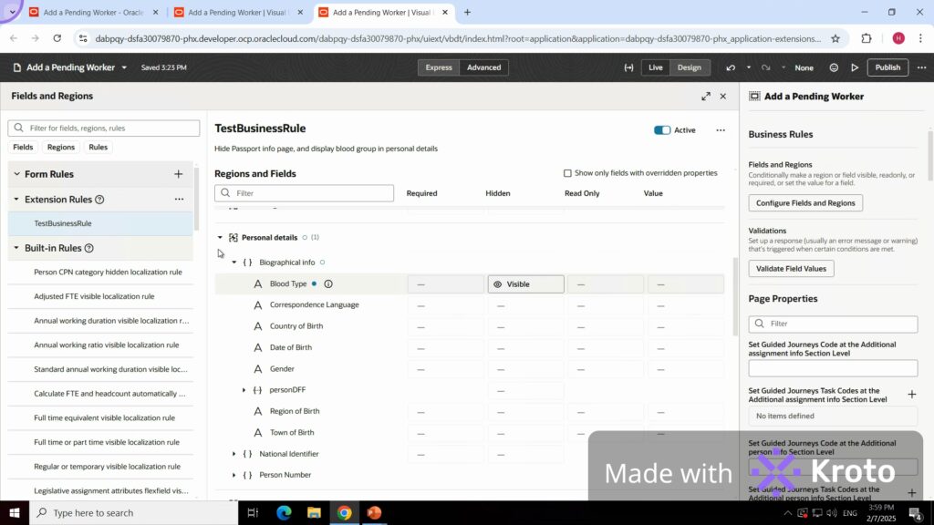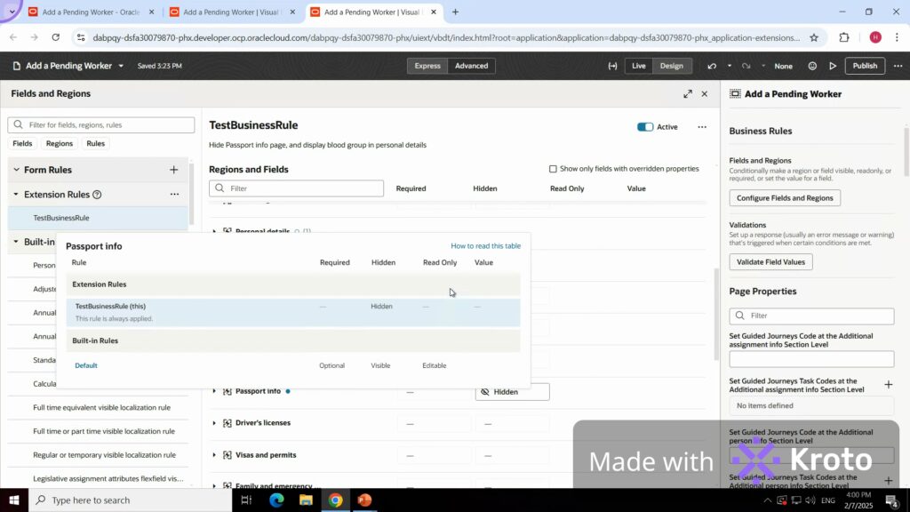 3) In this section, you need to add a form rule. For instance, you can create a rule named Test Business Rule and provide a description such as Hide Passport Info Page and Display Blood Group in Personal Details.