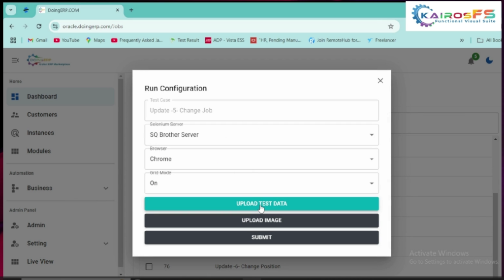 6. To execute any test case you must provide test data, upload the updated test data file and choose the browser on  which you want to view the execution. If you want to see the live execution keep grid mode on click on submit