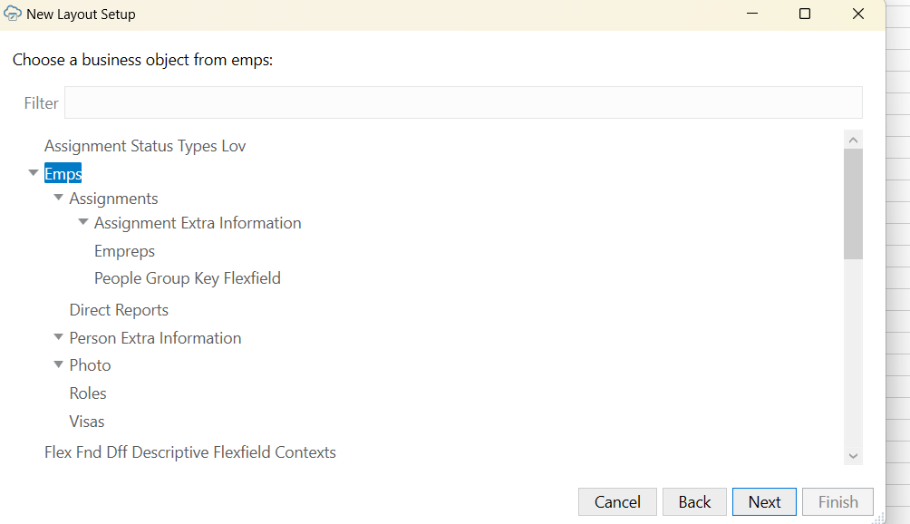1. In the subsequent dialog, choose the business object to download. For this tutorial, select emps and click Next.